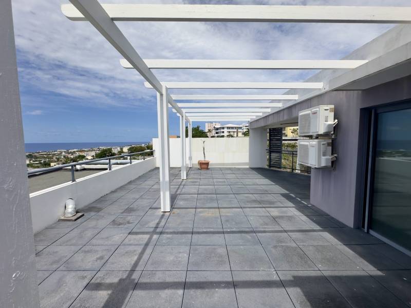 Visitez cet appartement récent, de type F4 Duplex aux derniers étages, avec ascenseur, d'une surface habitable de 89 m² environ + varangue et terrasse-pergola de 62 m² avec vue imprenable sur la ville et l'océan Indien.