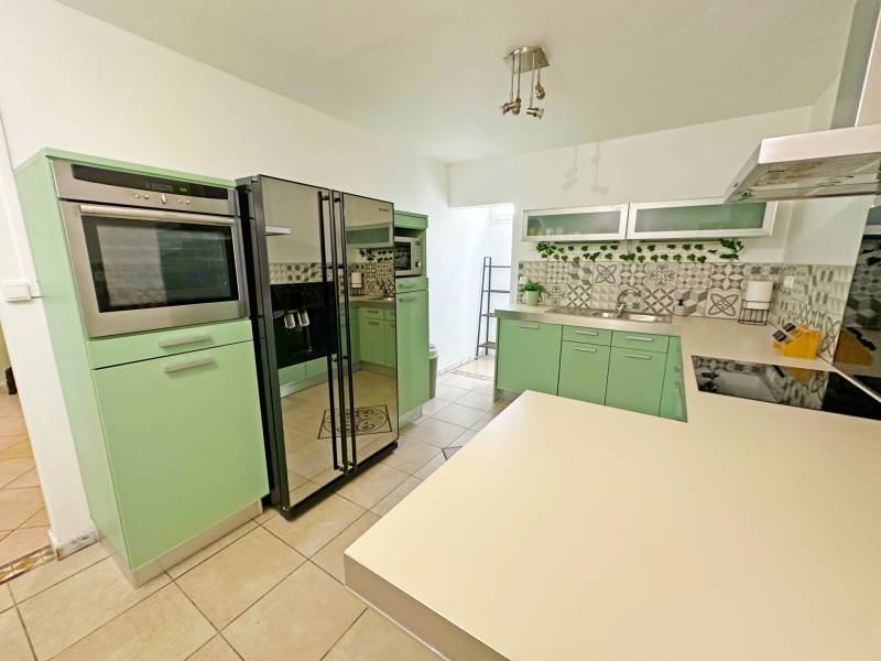 L'appartement est vendu avec une cuisine équipée (four, hotte, plaque de cuisson et lave vaisselle) et hors ameublement (séjour, chambres)