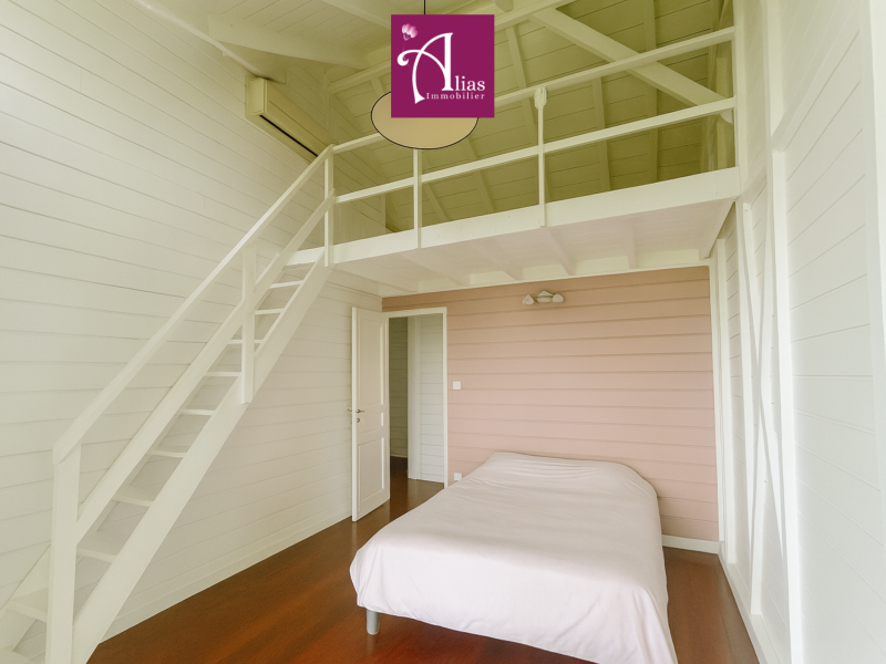À l’étage (entièrement en bois) : 2 chambres avec mezzanine, 1 salle d’eau + WC, et une suite parentale avec dressing, salle d’eau et WC