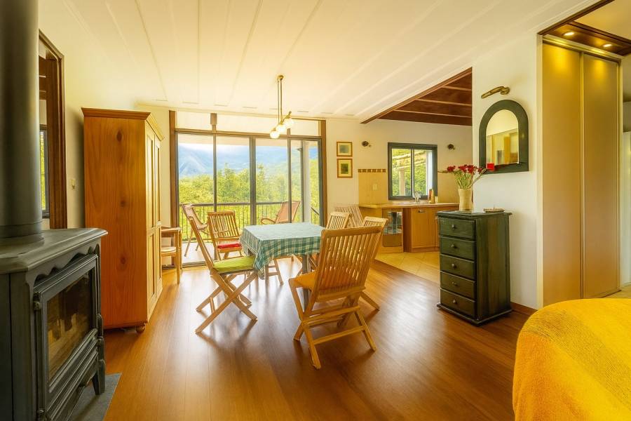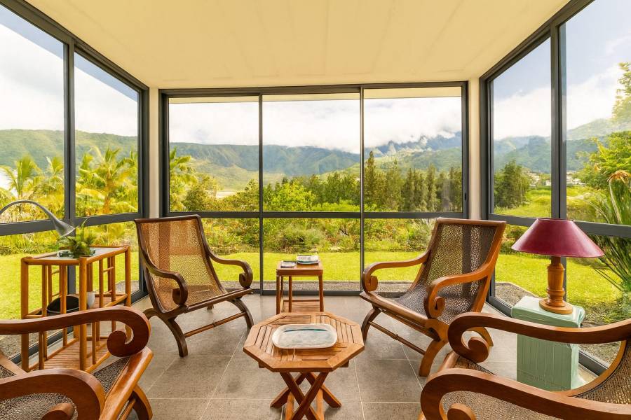 une véranda fermée avec un panorama imprenable sur les montagnes, pour profiter du cadre verdoyant tout au long de l'année.