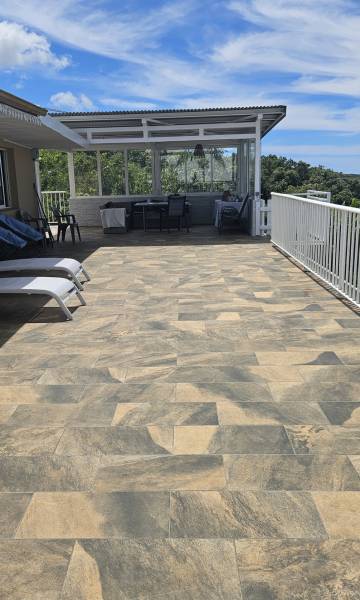 Elle est composée au rez-de-chaussée, de 2 chambres de 11 m2, 1 chambre de 17 m2 environ, un salon, une cuisine 14.5 m2, une grande buanderie et une salle à manger de 22 m2, donnant sur une très grande terrasse/varangue de 110 m2 avec une vue plongeante sur la piscine, et la mer.