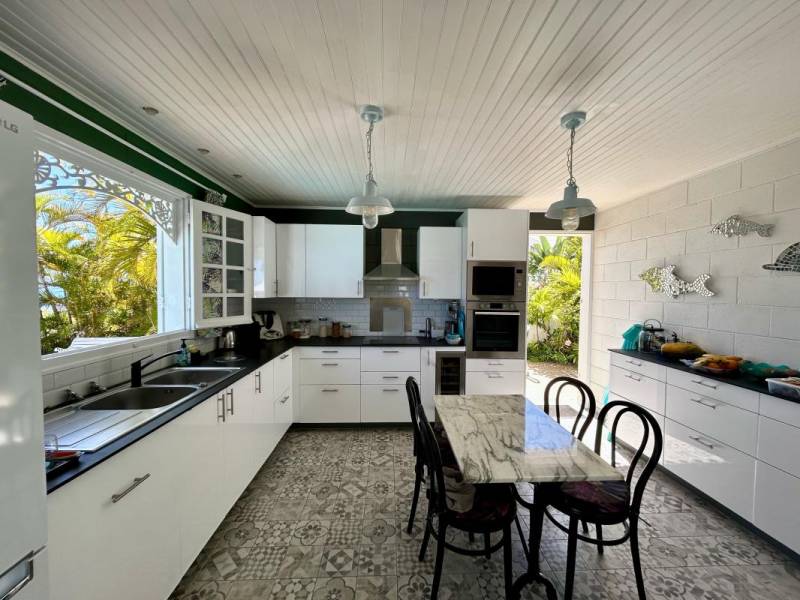 Vous profiterez de 5 chambres, 3 salles d'eau, une salle de bains, d'une cuisine entièrement équipée, une buanderie, une pièce de vie d'environ 40m2 donnant accès sur sa varangue de 25m2 environ face à la mer, d'un magnifique espace de vie extérieur arboré et entièrement aménagé avec sa piscine, son kiosque et son double garage de plus de 25m2 pouvant être transformé en logement indépendant.