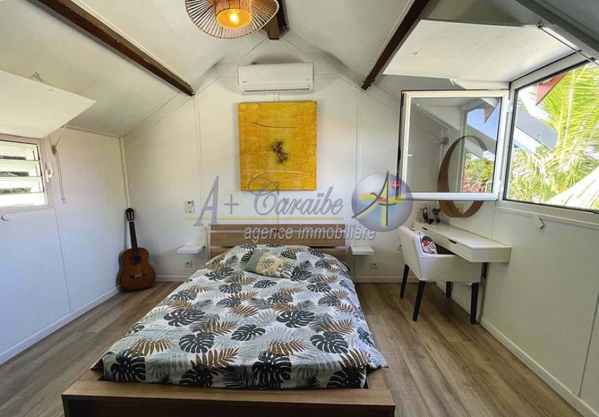 À l’étage, accessible depuis le hall de la maison, par un escalier en bois, vous y trouverez deux belles chambres soignées dont une climatisée et une spacieuse salle de bain avec wc.