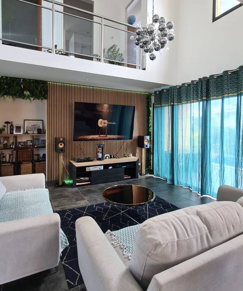 L’espace de vie s’ouvre sur une terrasse abritée par la pergola et sur la piscine, parfaite pour les moments de détente.