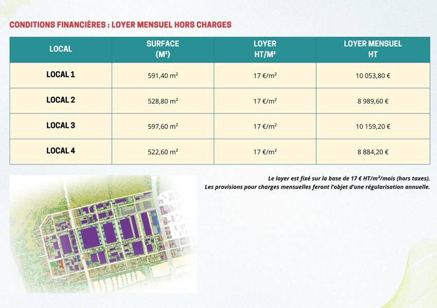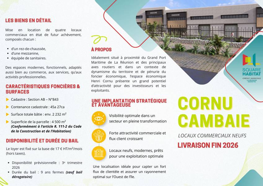 A LOUER -Locaux Commerciaux Neufs au coeur de la Future Zone Économique Cornu -Saint-Paul (97460) Typologie : Locaux commerciaux Copropriété : Non Situés au Rue Henri Cornu Bâtiment HENRI CORNU, Lot Pôle Économique HEVA -97460 Saint-Paul, ces futurs locaux bénéficieront d'un emplacement stratégique au sein de la future Zone Économique Cornu, un secteur en plein essor offrant une visibilité exceptionnelle et une attractivité croissante pour toutes activités commerciales et tertiaires. Une localisation idéale pour capter un fort flux de clientèle et assurer un rayonnement optimal sur l'Ouest de l'île. Mise en location de quatre locaux commerciaux en état de futur achèvement, composés chacun : d'un rez-de-chaussée, d'une mezzanine, équipée de sanitaires. Des espaces modernes, fonctionnels, adaptés aussi bien au commerce, aux services, qu'aux activités professionnelles. Livraison prévue : 3e trimestre 2026 Un emplacement d'avenir pour les entreprises ambitieuses ! Loyer : à partir de 8 884,20 euros Le loyer est fixé sur la base de 17 euros HT/m² (hors taxes). Les provisions pour charges mensuelles feront l'objet d'une régularisation annuelle. Les informations sur les risques auxquels ce bien est exposé sont disponibles sur le site de Géorisques : https://www.georisques.gouv.fr Pour tout renseignement, contactez Célia ! [coordonnées réservées] -[coordonnées réservées]