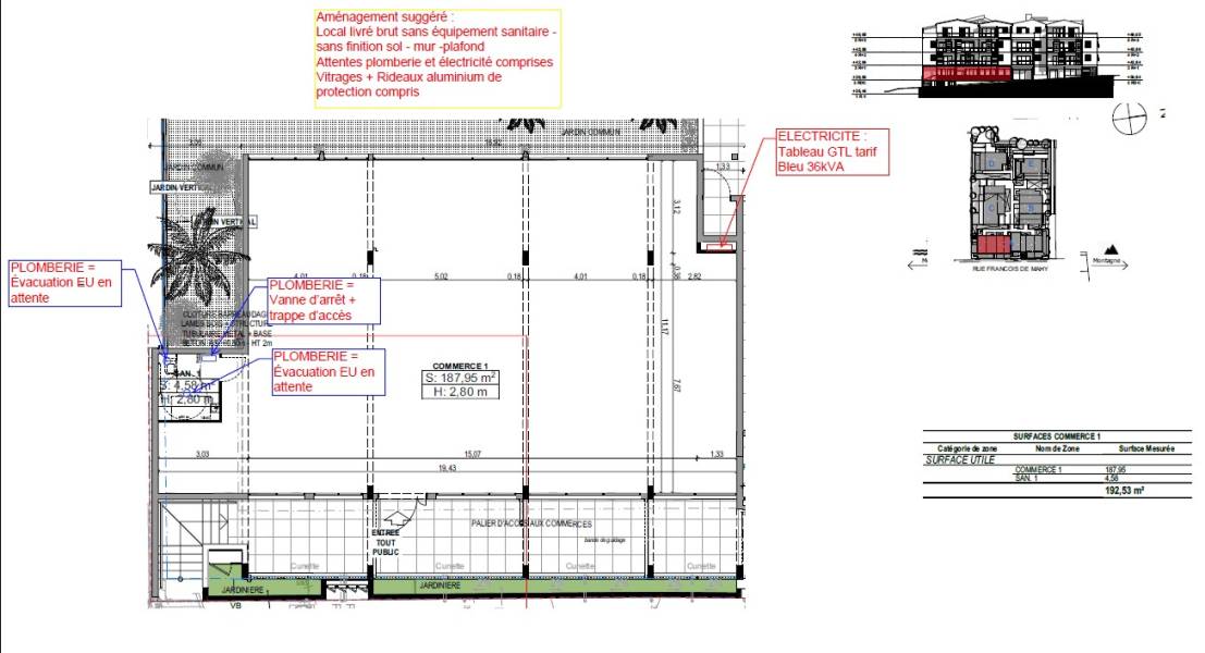 Le premier local s'étend sur environ 192.23 m2, offrant un espace généreux pour vos activités commerciales.