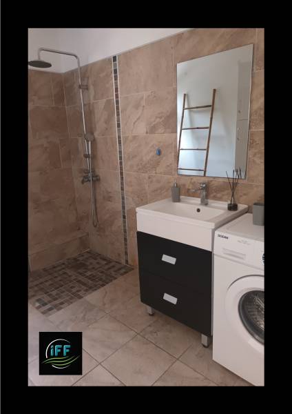 Il est composé d'un séjour, une cuisine ouverte aménagée et équipée (plaque de cuisson mixte et hotte), 2 chambres avec rangements, une salle d'eau avec une grande douche à l'italienne, 1 wc indépendant. Le chauffe-eau est solaire.