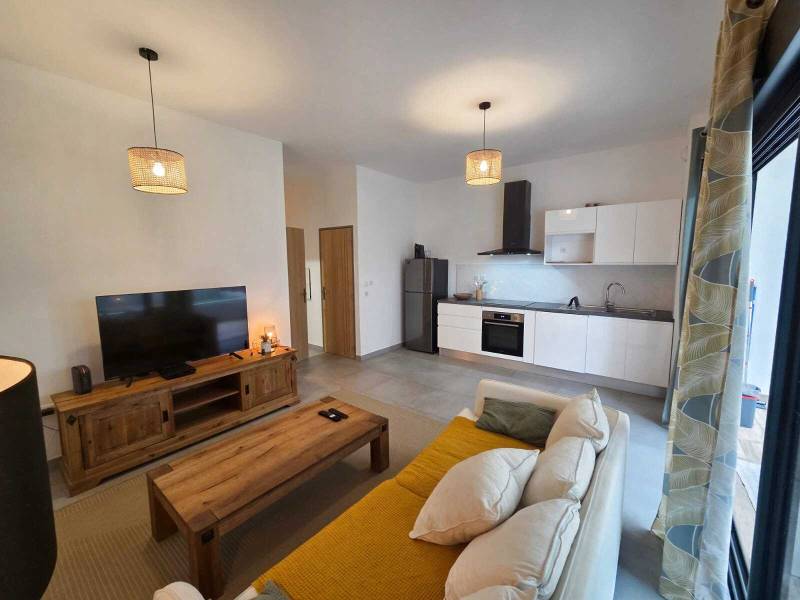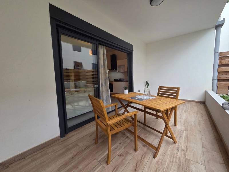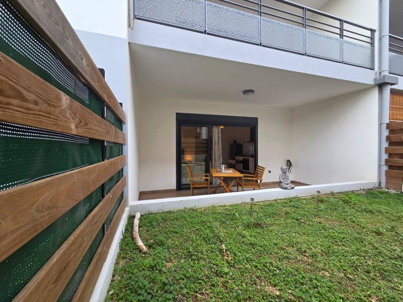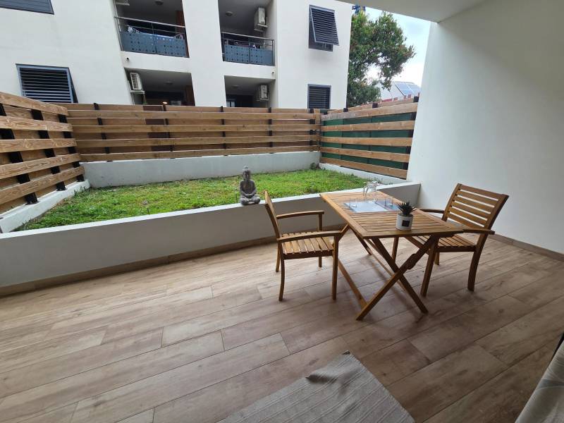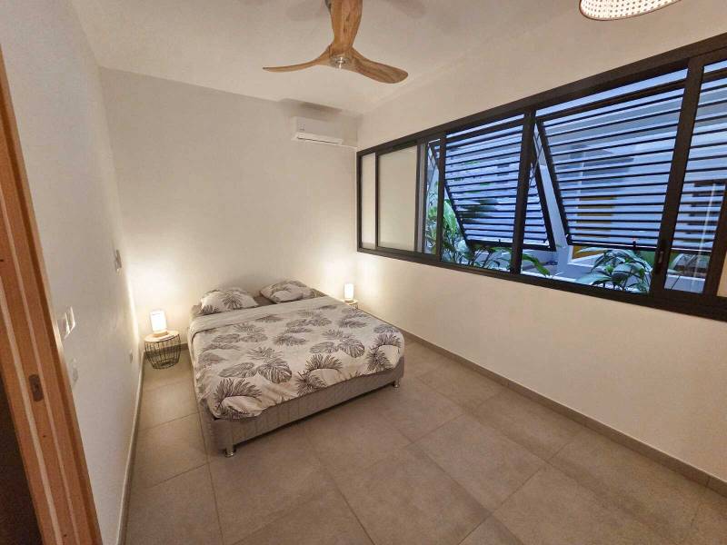 L'appartement est loué meublé. Il est composé, d'une grande chambre ventilée et climatisée, d'une salle d'eau, un WC, et un séjour/cuisine donnant sur une belle varangue (14,36 m2) et un jardinet privatif.
