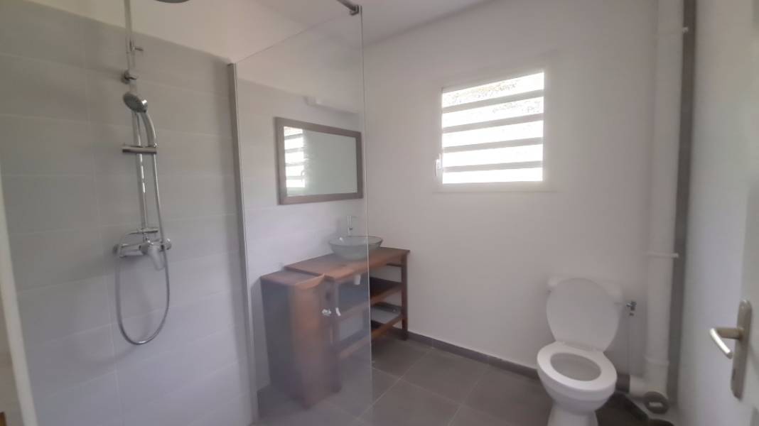 Salle d’eau neuve équipée d’une douche et d’un WC.