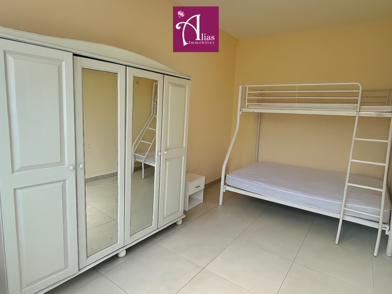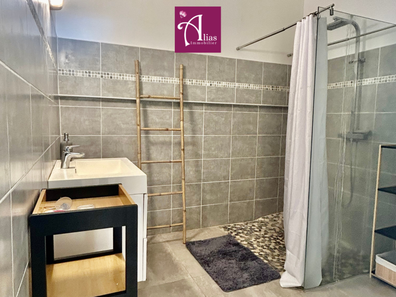 Elle se compose d'un grand séjour lumineux, trois chambres climatisées, une cuisine aménagée et équipée, une buanderie, un wc indépendant, une salle d'eau avec un wc, un bureau pouvant servir de 4ème chambre. Une terrasse couverte et une place de parking extérieure.