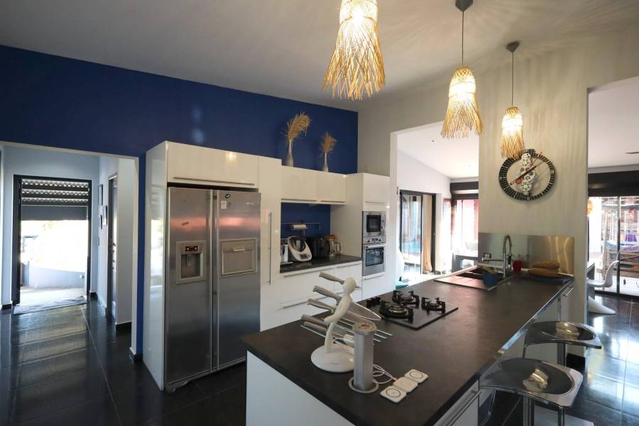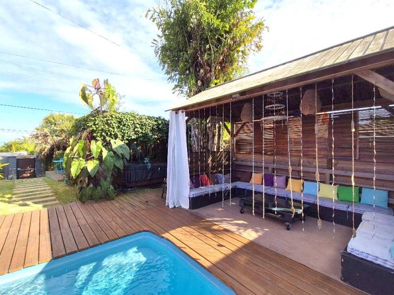 Terrasse arrière avec jardinet, coin varangue-salon d'extérieur, cuisine extérieure et bar.