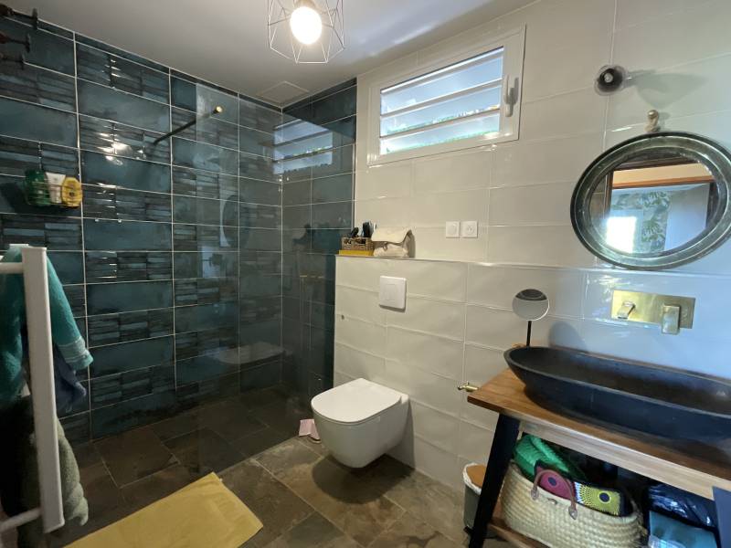 - Au RDC : Séjour, cuisine complètement équipée, 2 chambres, salle d'eau, WC, espace buanderie, varangue, jardin avec espace barbecue, abris de jardin et parkings
